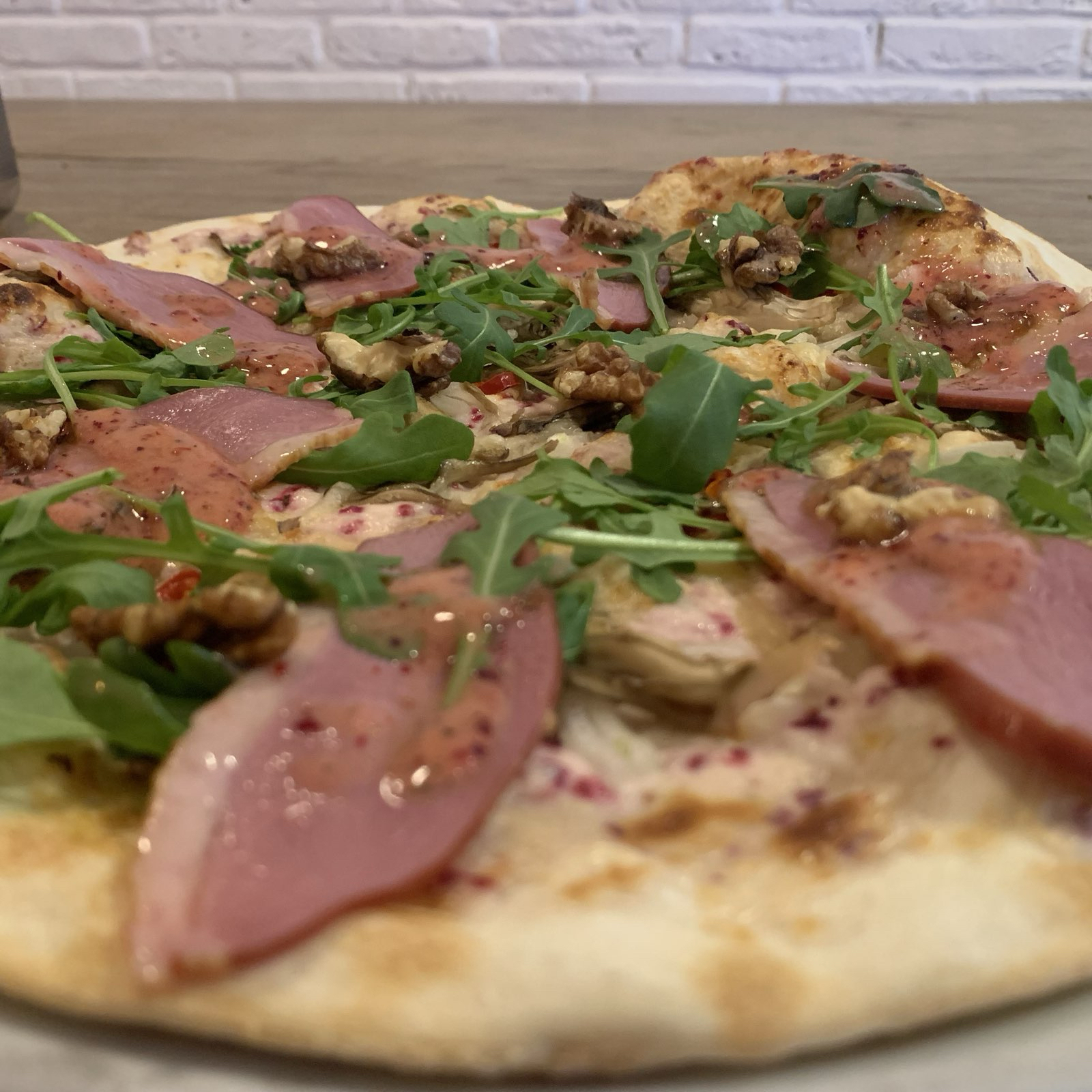 Indulge in our newest pizza: Cranberry Mascarpone, roasted garlic, mitake, chillies, onion & after baking topped with rocket, duck breast, cranberre vinaigrette, caramelized walnut.